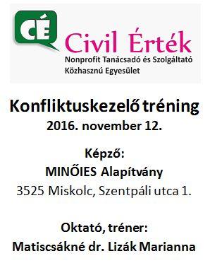 „Önmagunk megismerése egyben önmagunk legyőzését is jelenti.” /Müller Péter/ A "Civil Érték" Nonprofit Tanácsadó és Szolgáltató Közhasznú Egyesület jóvoltából 2016. 11. 12-én egy nagyon hasznos képzésen vehettem részt, amelynek témája a konfliktuskezelés volt. Az Egri Civil Házban Konstruktív együttműködés címmel fejleszthettük tudásunkat Matiscsákné dr. Lizák Marianna, az Eszterházy Károly Egyetem oktatója, a MINŐIES Alapítvány kuratóriumi titkárának segítségével, akiben egy gyakorlott, lendületes tréner-oktatót ismerhettünk meg. A résztvevők a Női Esélyegyenlőségi Civil Csoport tagjai voltak, akik közül 22 fő vett részt a programon. A csoport összetételében vegyes, mind korosztályban, mind foglalkozásukban különböző hölgyekből állt, ami még színesebbé tette a programot.